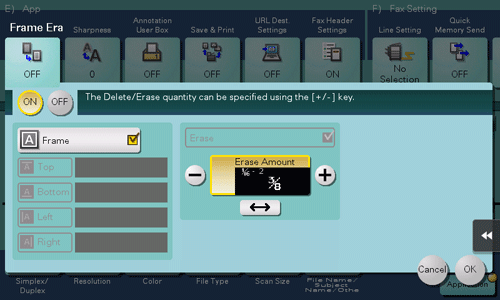 Specify a different width for each side of the original to erase the side. Cancel the [Frame] setting, select the side to erase the frame, and specify the width to erase in [Erase Amount]. If you do not want to erase the side, cancel the setting for [Erase].