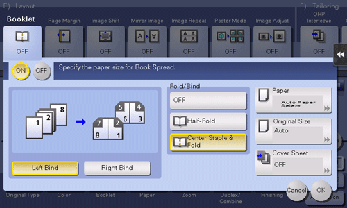 If Center Staple is enabled, [Booklet] is set to [ON] automatically.