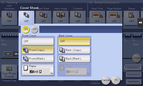 [ON]/[OFF] | Select [ON] to set Cover Sheet. |