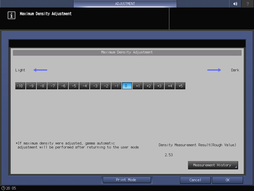 After outputting the charts, the screen returns to the Maximum Density Adjustment screen and the measurement result is displayed under Density Measurement Result (Rough Value) in the lower right of the screen.