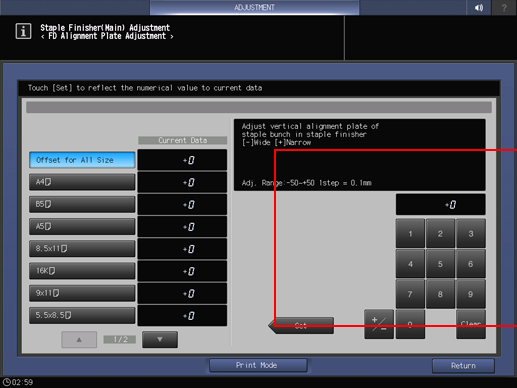The screen returns to the Staple Finisher(Main) Adjustment Menu screen.