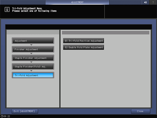 Press Finisher Adjustment, Staple Finisher Adjustment, Staple Finisher(Fold) Adj., Tri-Fold Adjustment, and Tri-Fold Position Adjustment in sequence.