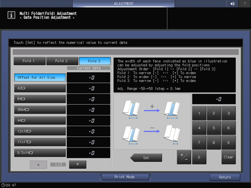 Objects of Adjustment: Offset for All Size, A3 short edge feed, B4 short edge feed, SRA4 short edge feed, A4 short edge feed, 12 18 short edge feed, 11 17 short edge feed, 8.5 14 short edge feed, 8.5 11 short edge feed, 8K short edge feed, Custom(380~458 mm), Custom(279~379 mm)