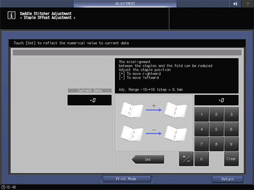 The screen returns to the Saddle Stitcher Adjustment Menu screen.