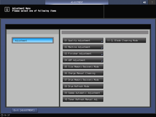 1. Press Adjustment on the MACHINE screen to display the Adjustment Menu screen.