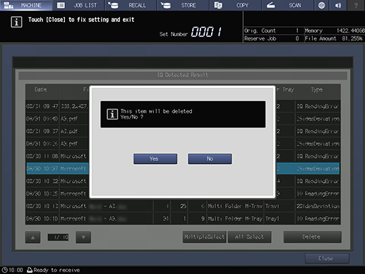 Type | Displays the type of the detected error. 2SidesDeviation: Detected and displayed when the deviation amount exceeds the value specified in Auto Image Adjustment Deviation Check. IQ ReadingError: Displayed when the machine cannot detect the position detection mark printed in the trim margin of output paper. Spot: Displayed when an image spot is detected by automatic inspection. |