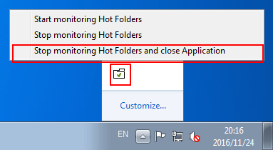 When the icon is displayed in the task tray, right-click the icon, and click Stop monitoring Hot Folders and close Application.