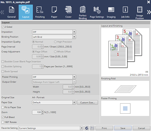 The setting items here are the same as those of the Layout screen of the PS Plug-in driver except the settings of Poster Printing. For details about the description of the common setting items, refer to Layout Screen.