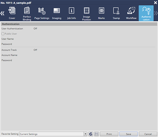 On the Authentication screen of the PS Plug-in driver, you need to enter the setting information of either the user authentication or the account track or both of them. However, in Print Manager, configuration information is automatically displayed, so you do not need to enter it. For details about the description of the setting items, refer to Authentication Screen.