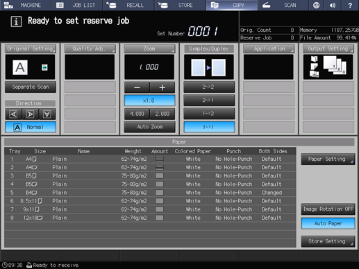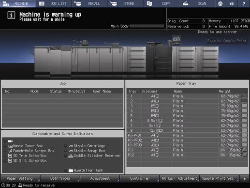 supplementary explanationPressing the COPY tab on the screen during warm-up displays the COPY screen. When the message Ready to set reserve job appears on the COPY screen, you can set reserve jobs and scan originals while the machine is warming up so that the machine starts printing immediately after warm-up is completed. For details, refer to Reserving Copy Jobs during Warm-up.