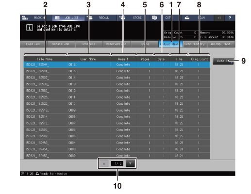The Output Hist. screen of the JOB LIST screen provides a list of the past 100 output histories.