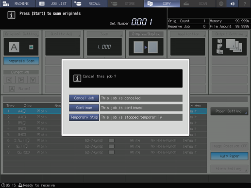 • supplementary explanationPress Temporary Stop to suspend the job. When the job is suspended, some settings can be changed. Press Start on the control panel to resume the job.