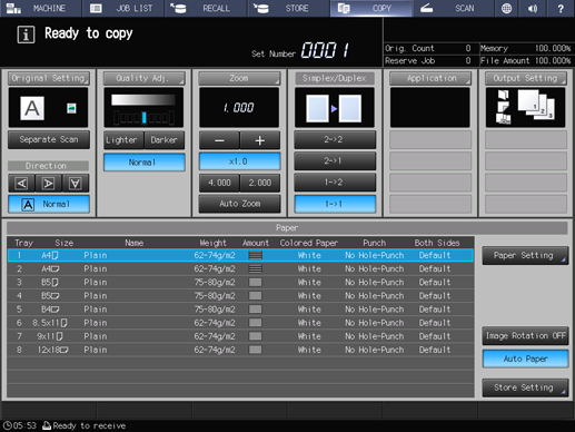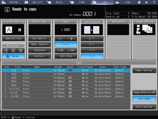 Up to 4 shortcut keys for frequently-used adjustment items can be displayed under Quality Adj. on the COPY screen. These keys allow you to directly jump to the adjustment screen for each. The setting of shortcut keys can be made from User Setting in the Utility menu.