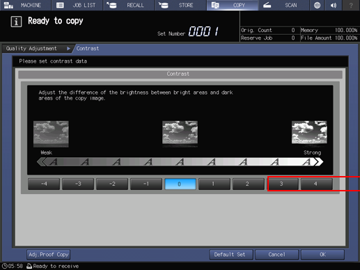 After making the desired adjustment, press Adj.Proof Copy on the Quality Adjustment screen, Adj.Proof Copy on the Contrast screen, or Proof Copy on the control panel. Check the adjustment result with output image.