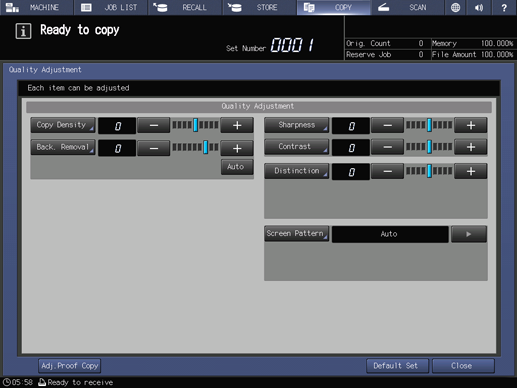 supplementary explanationTo resume the standard level and return to the Quality Adjustment screen, press Default Set.