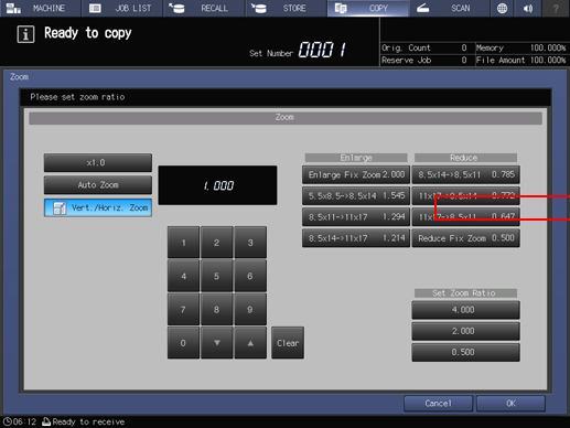 Press Vert./Horiz. Zoom to highlight it. Then, use the touch panel keypad or downup to enter the desired magnification ratio. The entered ratio is displayed on the screen.