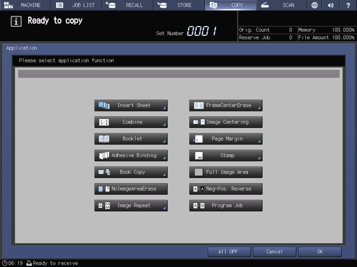 No Image Area Erase is set automatically, but it is released when the ADF is used. No Image Area Erase can be released manually. The incompatible function keys are dimmed to show inactivity.