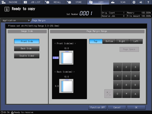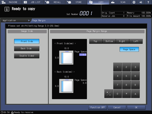 supplementary explanationTo resume the original settings, press Cancel. To cancel the Page Margin function with the current setting saved, press Function OFF.