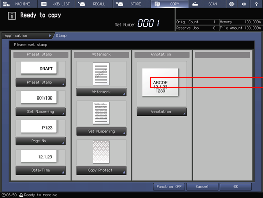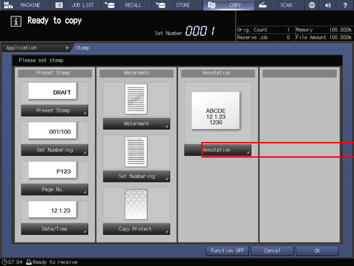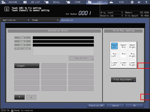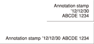 Annotation | This function allows you to recall a predefined combination of text, date/time to load the original, and annotation number of the original and to print them onto output copies at the designated location. | ||
