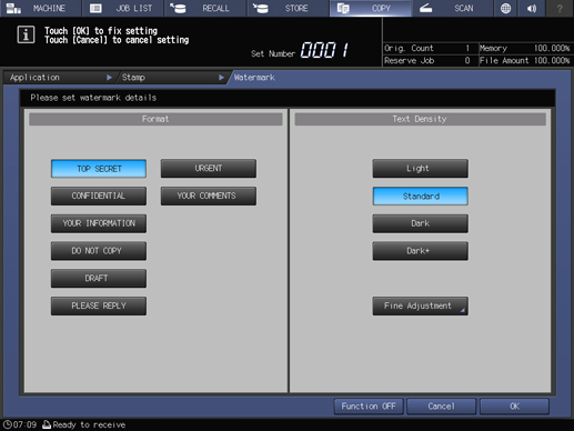 supplementary explanationIf adjustment of the centered watermark position is required, press Fine Adjustment under Text Density.