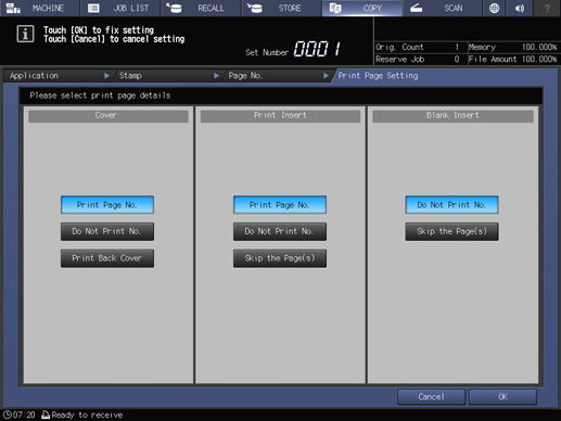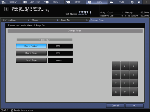 supplementary explanationUse the touch panel keypad or downup to enter the start number in the range from 1 to 99999. To print on all pages, enter 0 to display ----- (no setting).