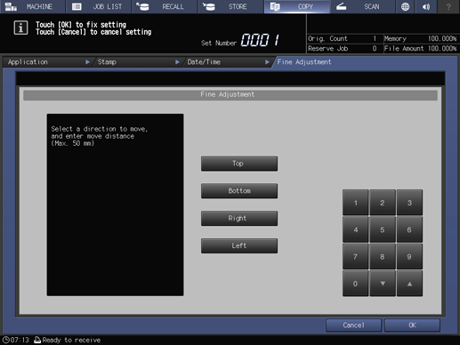 Select Preset Stamp, Numbering, Page No., Date/Time, Watermark, and Annotation to make fine adjustments for the printing position. Fine Adjustment is provided in the screen for each function. Pressing Fine Adjustment displays the following screen. The adjustment range is 0 to 1.96 inches (0 to 50 mm), in lengthwise direction (Top or Bottom) and in widthwise direction (Right or Left).