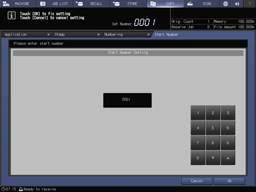 supplementary explanationUse the touch panel keypad or downup to enter the start number in the range from 1 to 99999. Entering 0 automatically sets the start number to 1.
