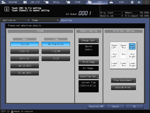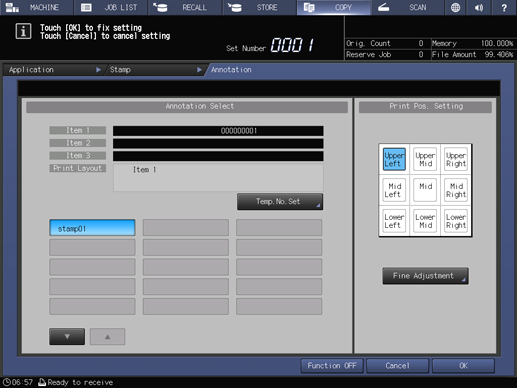 This function allows you to recall a predefined combination of text, date/time to load the original, and annotation number of the original and to print them onto output copies at the designated location. The annotation number can be changed temporarily on the Annotation screen after recalling the predefined setting (Temp.No.Set).
