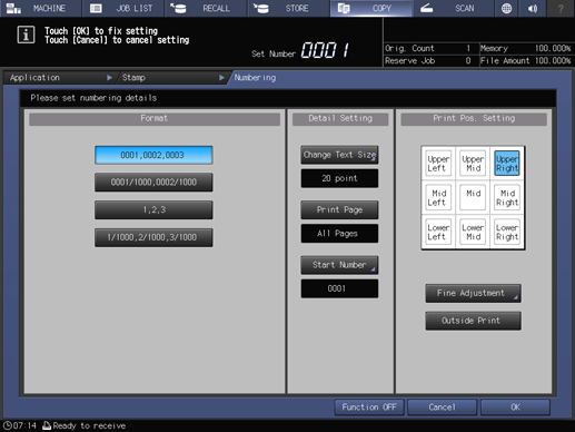 supplementary explanationFor details about the settings for Fine Adjustment, Change Text Size, and Start Number, refer to Making fine adjustment on printing position, Changing the text size for numbering, and Start Number setting for Set Numbering mode.