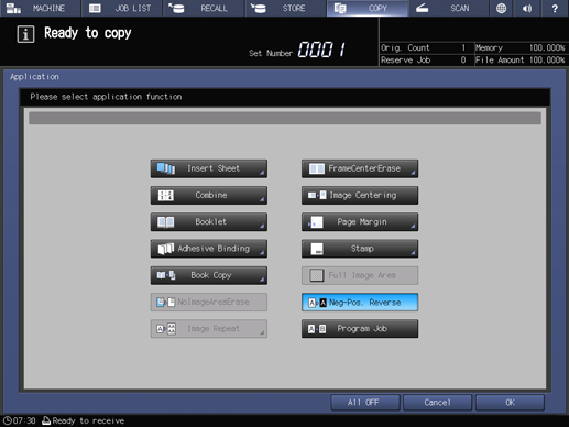The Neg-Pos. Reverse icon and shortcut key are displayed under Application on the COPY screen.