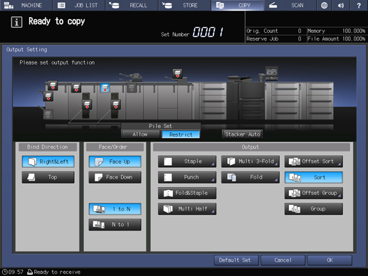 supplementary explanationWhen Large Capacity Stacker LS-506 is mounted, Pile Set is displayed. If two Large Capacity Stacker LS-506 units are mounted, Stacker Auto is displayed. For details, refer to Switching Stacker Automatically.