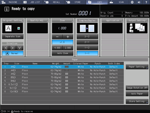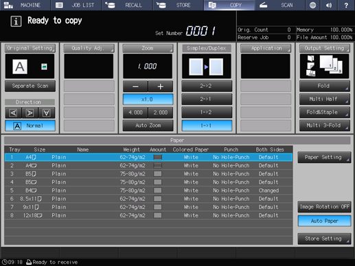 Up to 4 shortcut keys for frequently-used output settings can be displayed under Output Setting on the COPY screen. These keys allow you to set the output function at a single touch, or to directly jump to the setting screen for each. The setting of shortcut keys can be made from User Setting in Utility Menu.