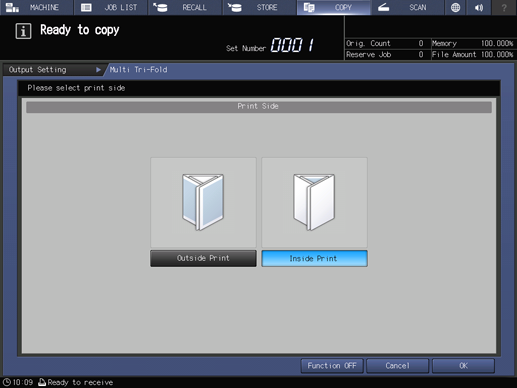 The machine with Saddle Stitcher SD-506 mounted can fold a copied set inside in three. Using Multi 3-Fold, the print side can be specified. Finished sets are delivered to the multi tri-fold mode tray.