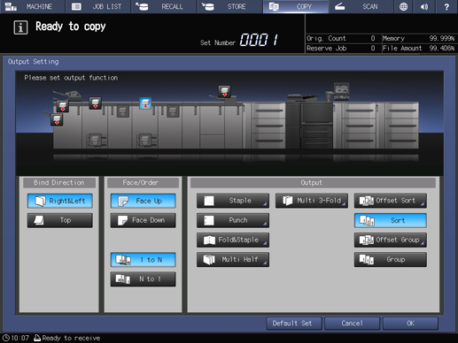 An icon representing specified output mode is displayed under Output Setting on the COPY screen.