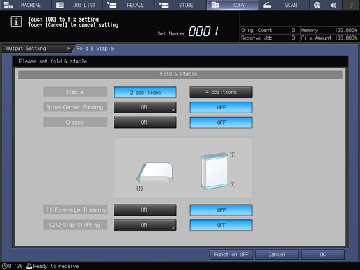 When the machine is equipped with Saddle Stitcher SD-513 with Folding Unit FD-504 mounted, spine forming is available in combination with Fold&Staple.