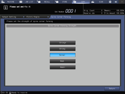 Fold&Staple (+ (1) Fore-edge Trimming) Select ON for Spine Corner Forming on the Fold&Staple setting screen. | Select Spine Corner Forming Strength from Strong+, Strong, Normal, Weak, and Weak+. |
