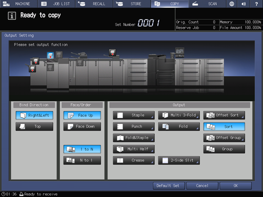 An icon representing specified function is displayed under Output Setting on the COPY screen.