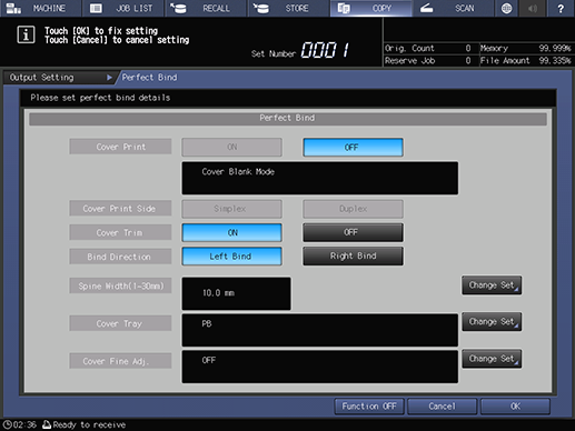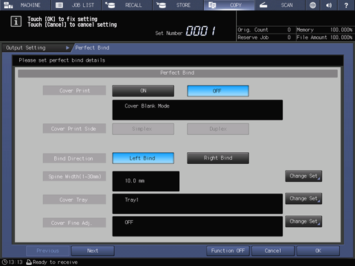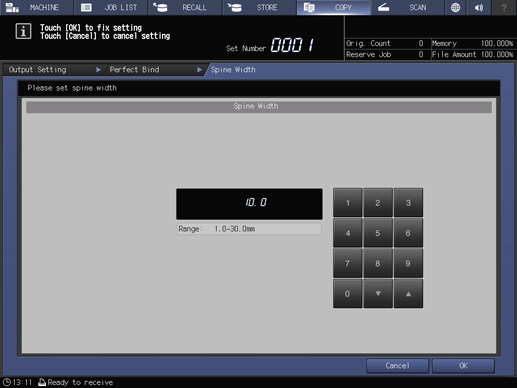 supplementary explanationPress Change Set in the right of Spine Width (1 to 30 mm) to display the Spine Width screen.