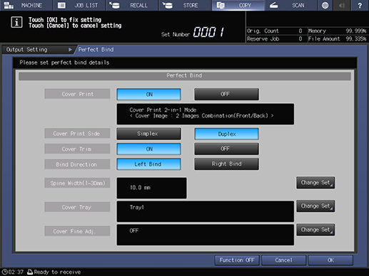 The perfect binging icon is displayed under Output Setting on the COPY screen.