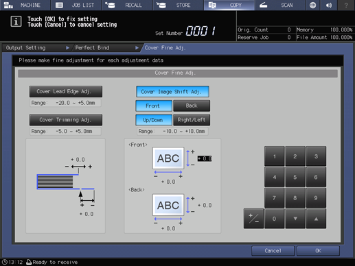 supplementary explanationTo make fine adjustment for the trimming amount, press Cover Trimming Adj.. Use the touch panel keypad, down, up, or the keypad on the control panel to enter the desired numeric value. Then, press + / - to select the positive or negative adjustment value.