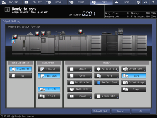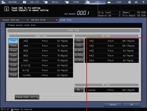 supplementary explanationWhen you select a tray other than the cover tray of the perfect binder for cover sheets while Saddle Stitcher SD-513 is mounted on the machine, the crease and both sides adjustment functions of the saddle stitcher become available for covers. For details, refer to Creasing Paper and 2-Side Slitting.