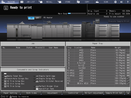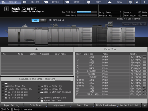 The status of the perfect binder heater can be checked on the MACHINE screen. In general use, PB Shut Off is displayed.