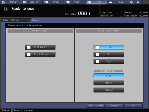 supplementary explanationWhen you select any one of 2 Position Staple, also select Wide, Narrow, or Narrow+ to specify the staple pitch.