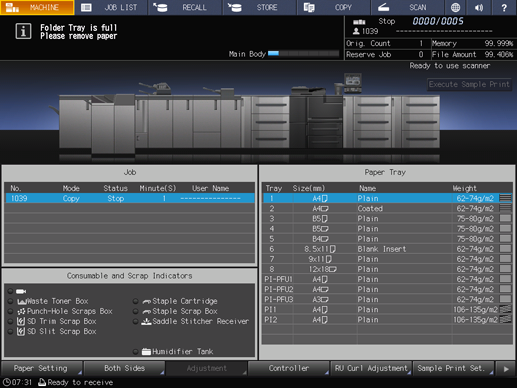 At this time, the message Folder Tray is full / Please remove paper is displayed in the message area of the screen, and the Start LED turns orange. The machine cannot restart printing even if you press Start on the control panel.