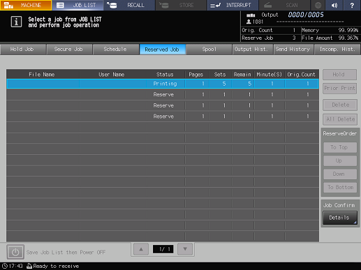 supplementary explanationDuring interrupt copying, the interrupt job is displayed at the top of the Reserved Job list in the JOB LIST screen.
