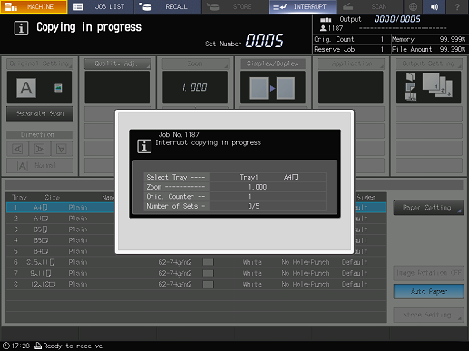 Use the Interrupt mode to interrupt copying in progress to copy with different settings temporarily.