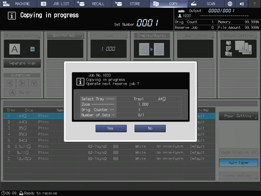If you press No, the screen selected in Default Screen Setting is displayed. If you press the COPY tab at this time, the COPY screen is displayed and jobs can be reserved.