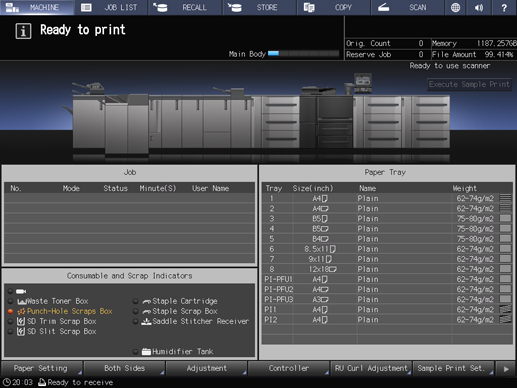 Also, the Punch-Hole Scraps Box indicator in the Consumable and Scrap Indicators area of the MACHINE screen lights up red, and the text color changes to yellow.