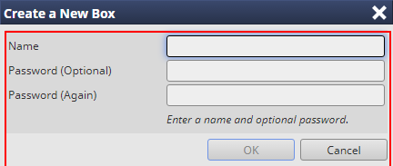 supplementary explanationEnter the name in Name on the Create a New Box screen. Enter the password in Password as needed. Click OK to display the created Box in the tree on the left.