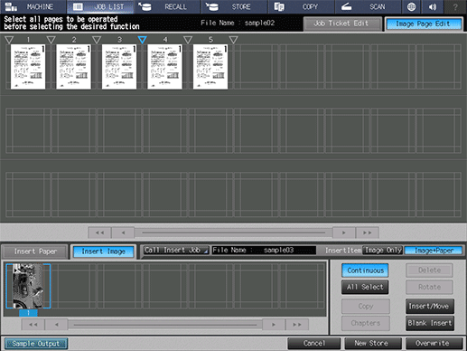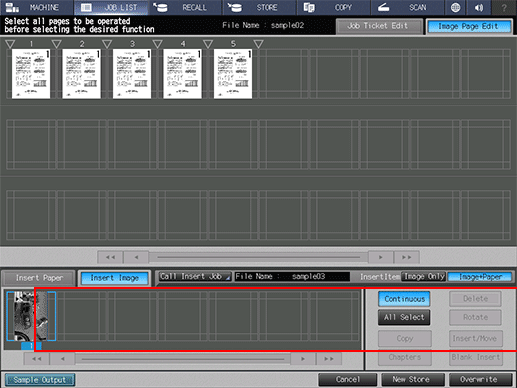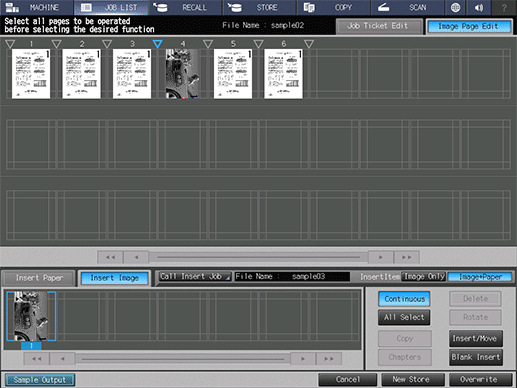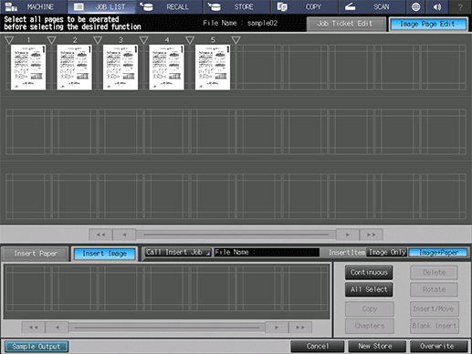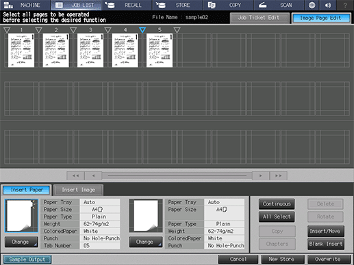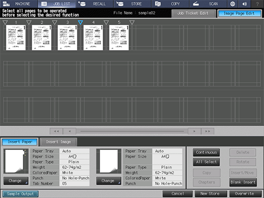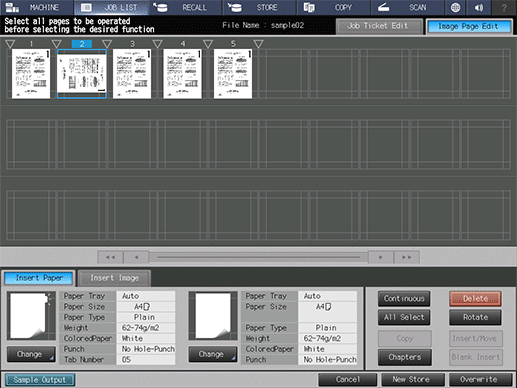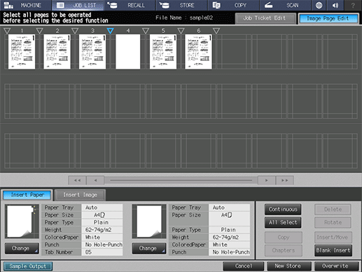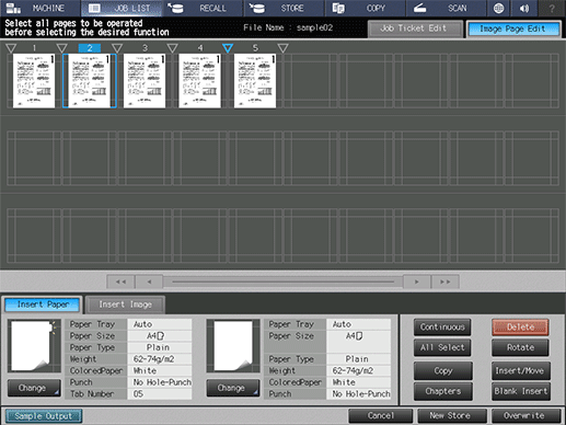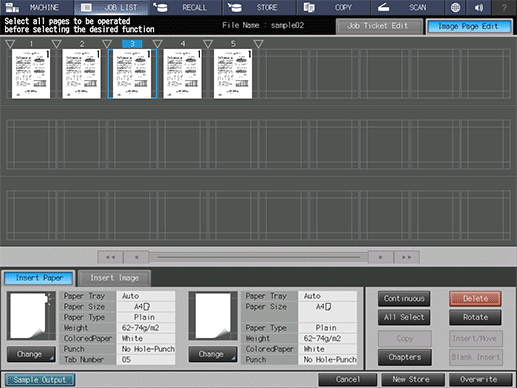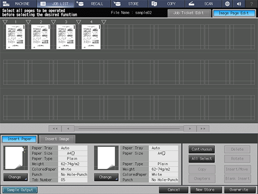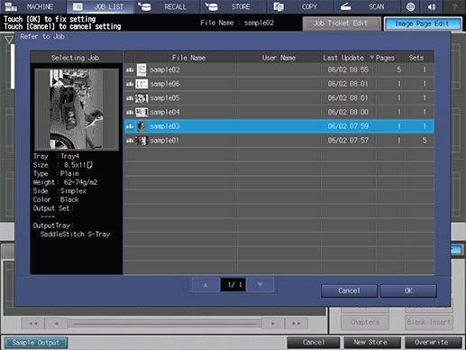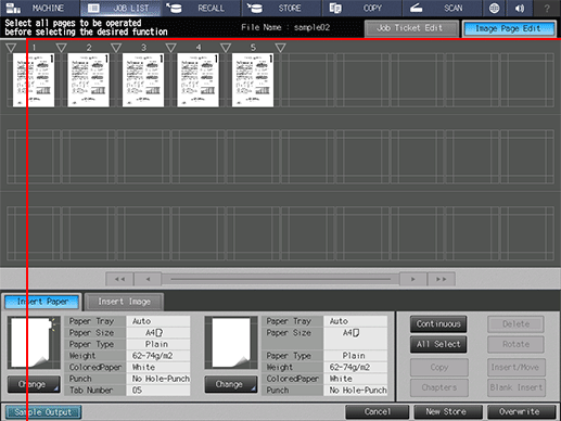 supplementary explanationTo display the Job Ticket Edit screen, press the Job Ticket Edit tab. To return to the Image Page Edit screen, press the Image Page Edit tab. For details, refer to Secure Job: Overview of Page Editing.